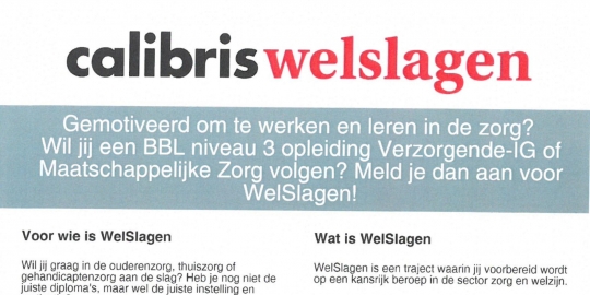Dan biedt Calibris Welslagen je de mogelijkheid om jouw droom werkelijkheid te maken door je een leerwerktraject (BBL) aan te bieden bij een zorgwerkgever in jouw omgeving. Wij bieden plaatsen in Tilburg en directe omgeving.