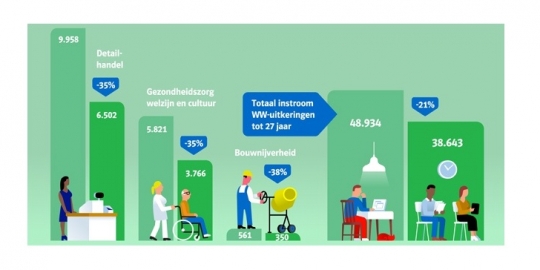 In 2017 verstrekte UWV ruim 61.500 nieuwe WW-uitkeringen aan jongeren tot 27 jaar, een daling van 18.500 (-23%) ten opzichte van het jaar daarvoor. In de sectoren detailhandel, gezondheidszorg, welzijn & cultuur en bouwnijverheid is de afname het grootst. De instroom van jongeren in de WW daalt het minst in de sector industrie, nutsbedrijven & delfstoffen.